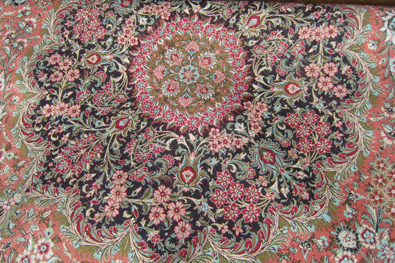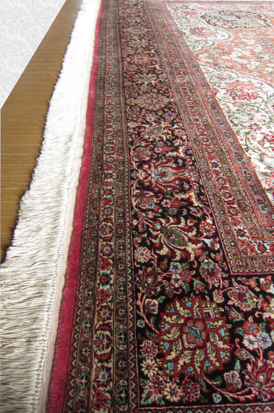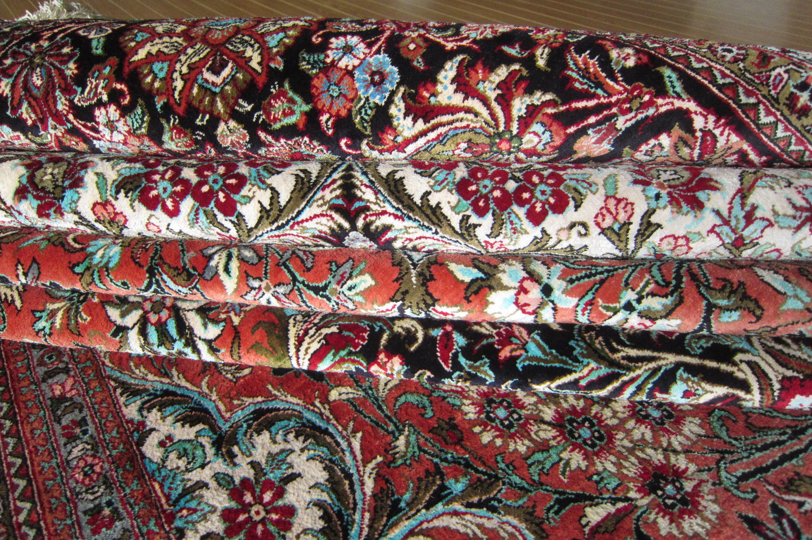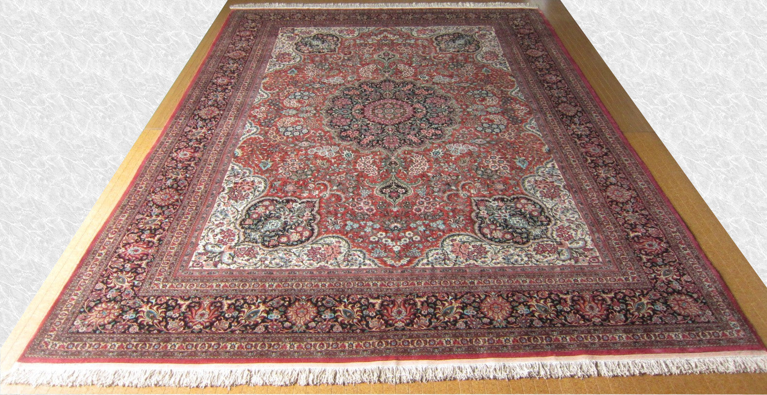 赤い地がゴージャスな絨毯です。リビングの広い範囲をカバーできます。