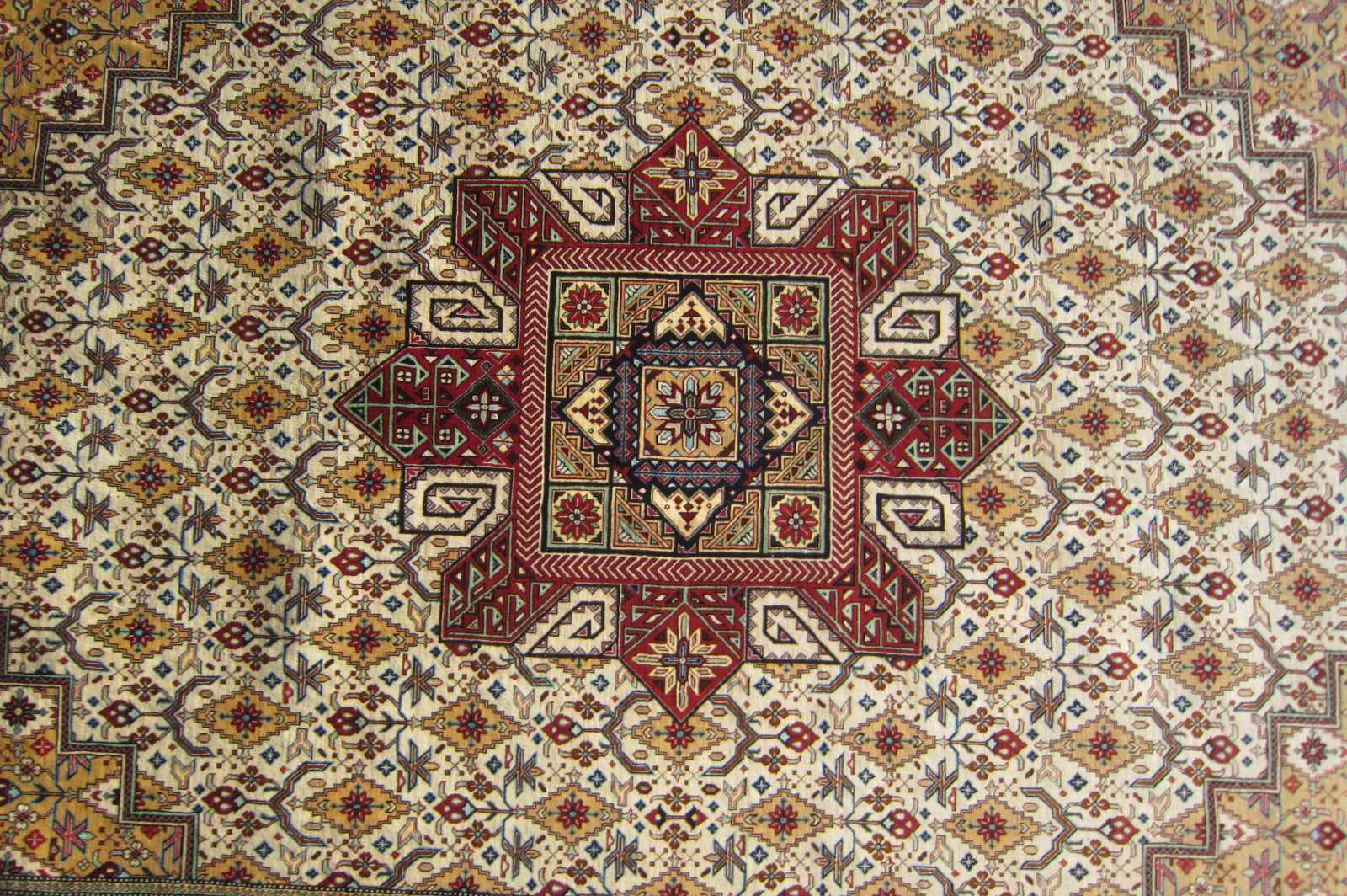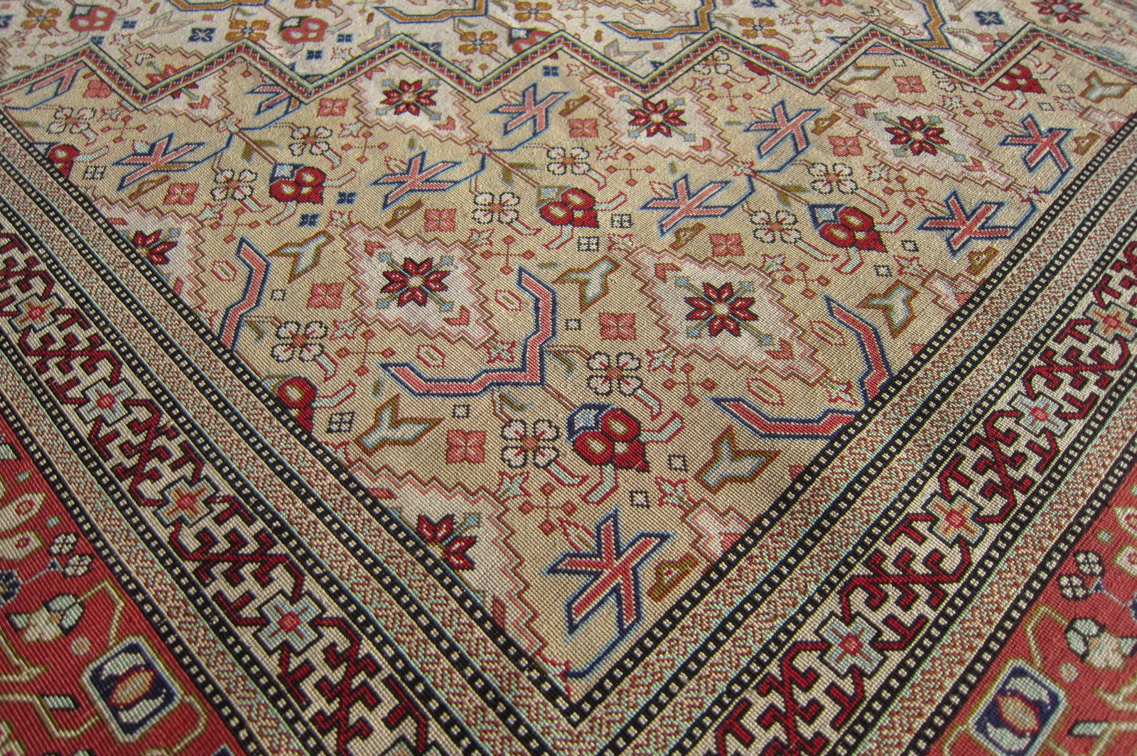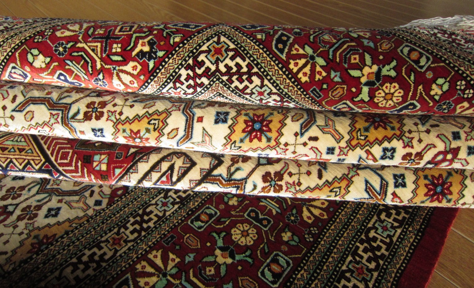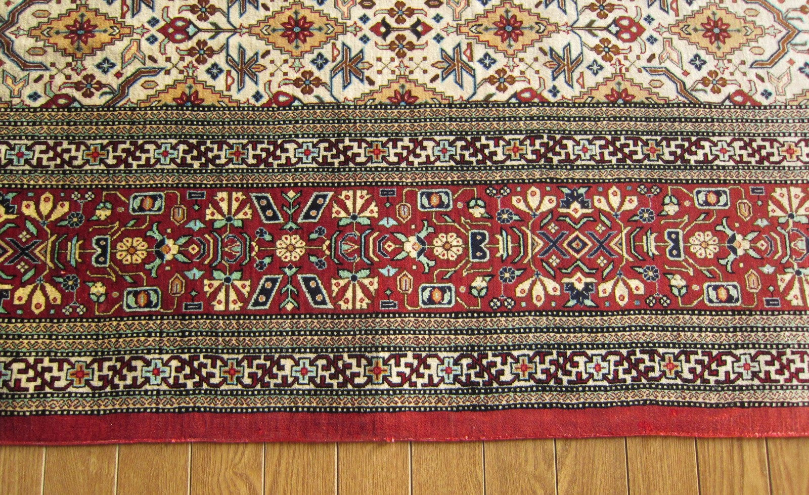 深紅の縁に囲まれたベージュ基調の落ち着いた絨毯です。