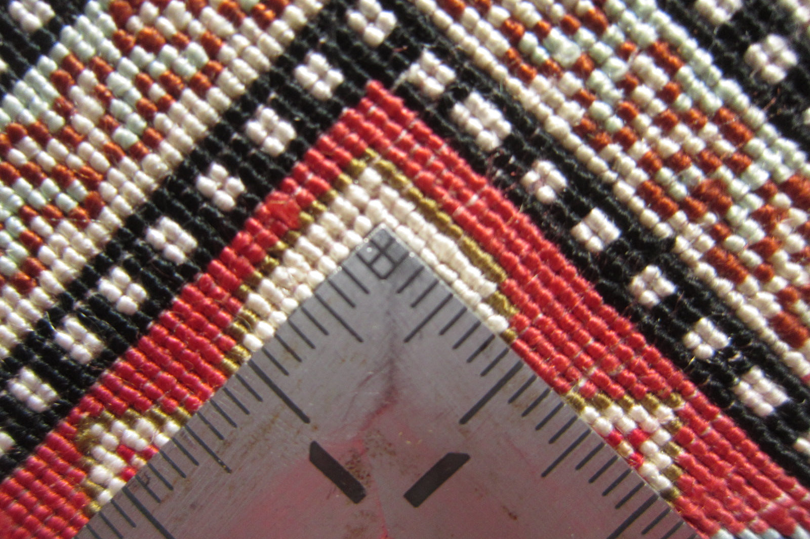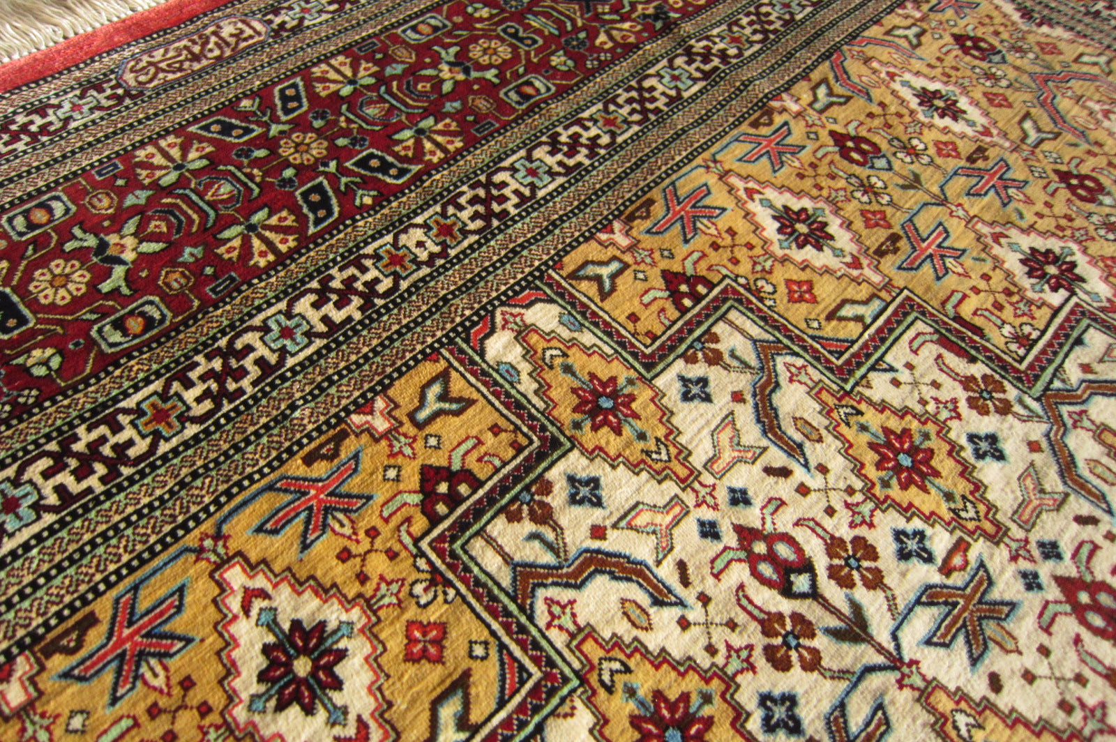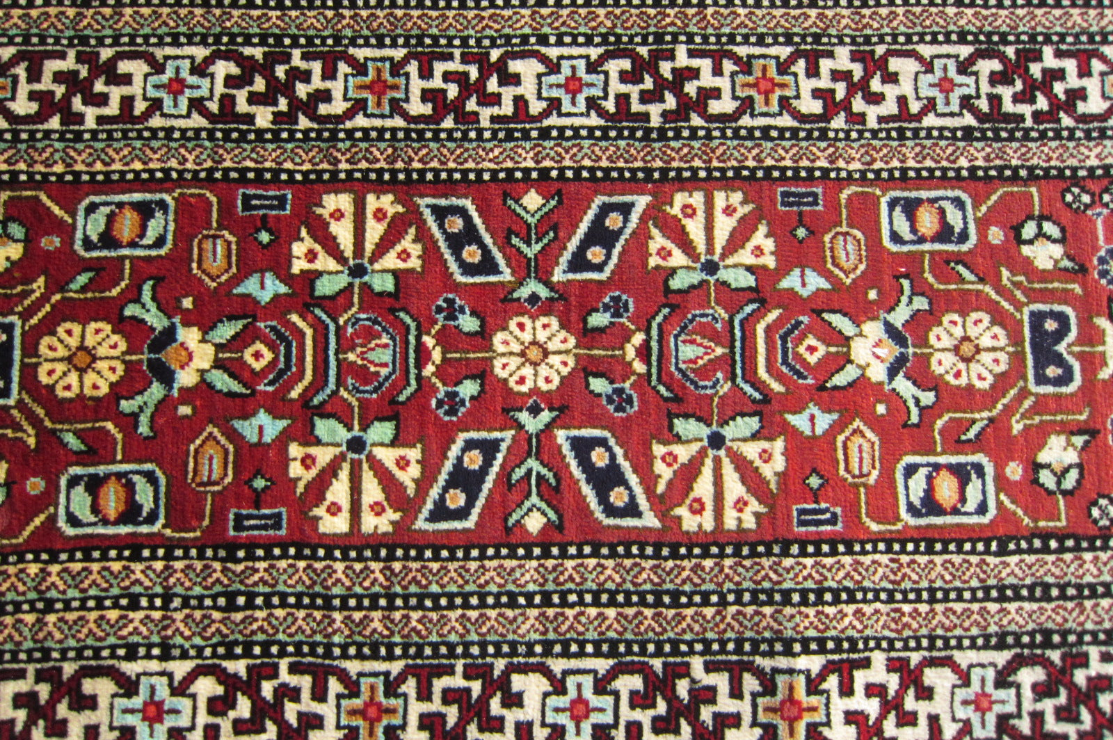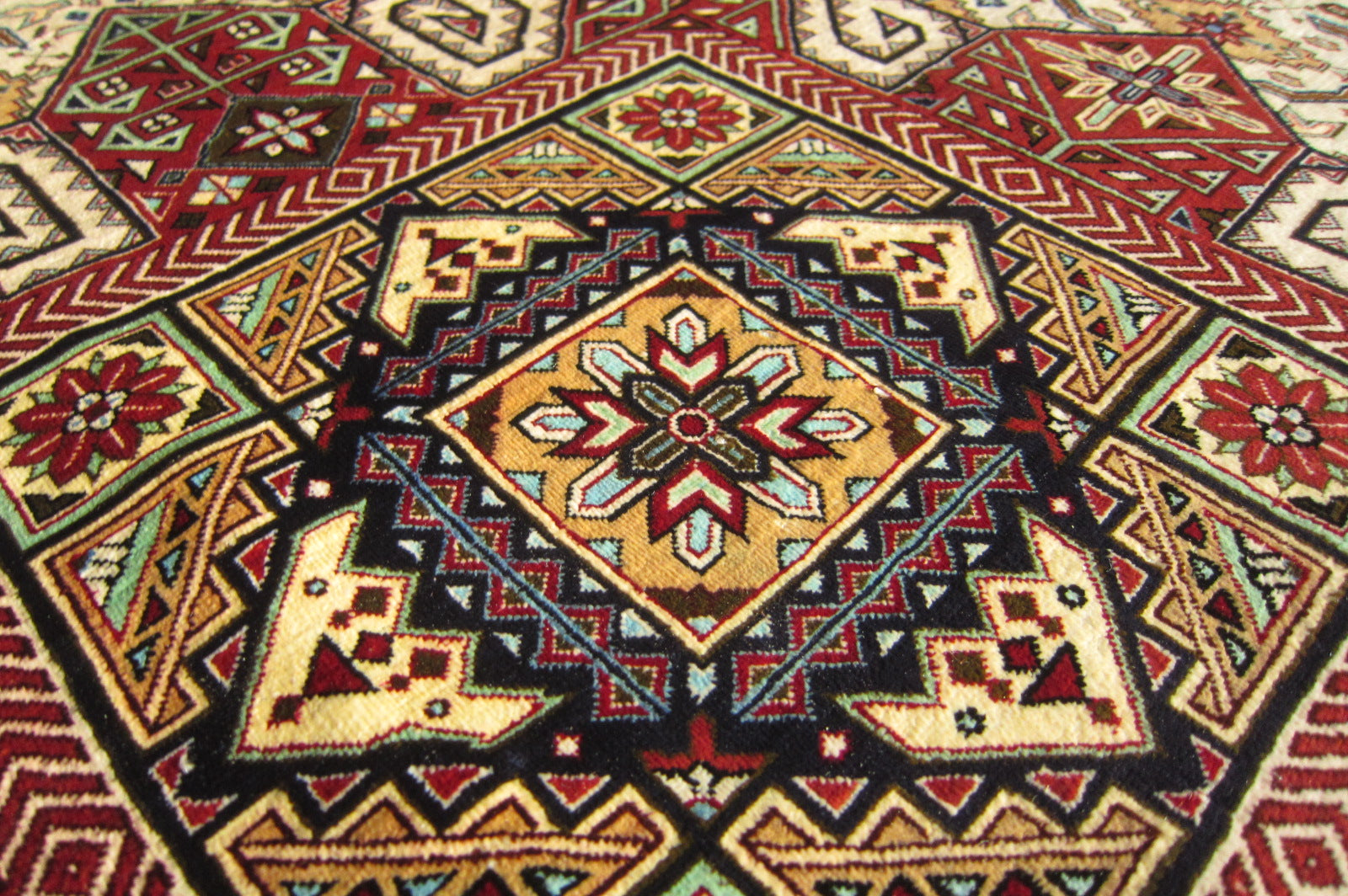 深紅の縁に囲まれたベージュ基調の落ち着いた絨毯です。