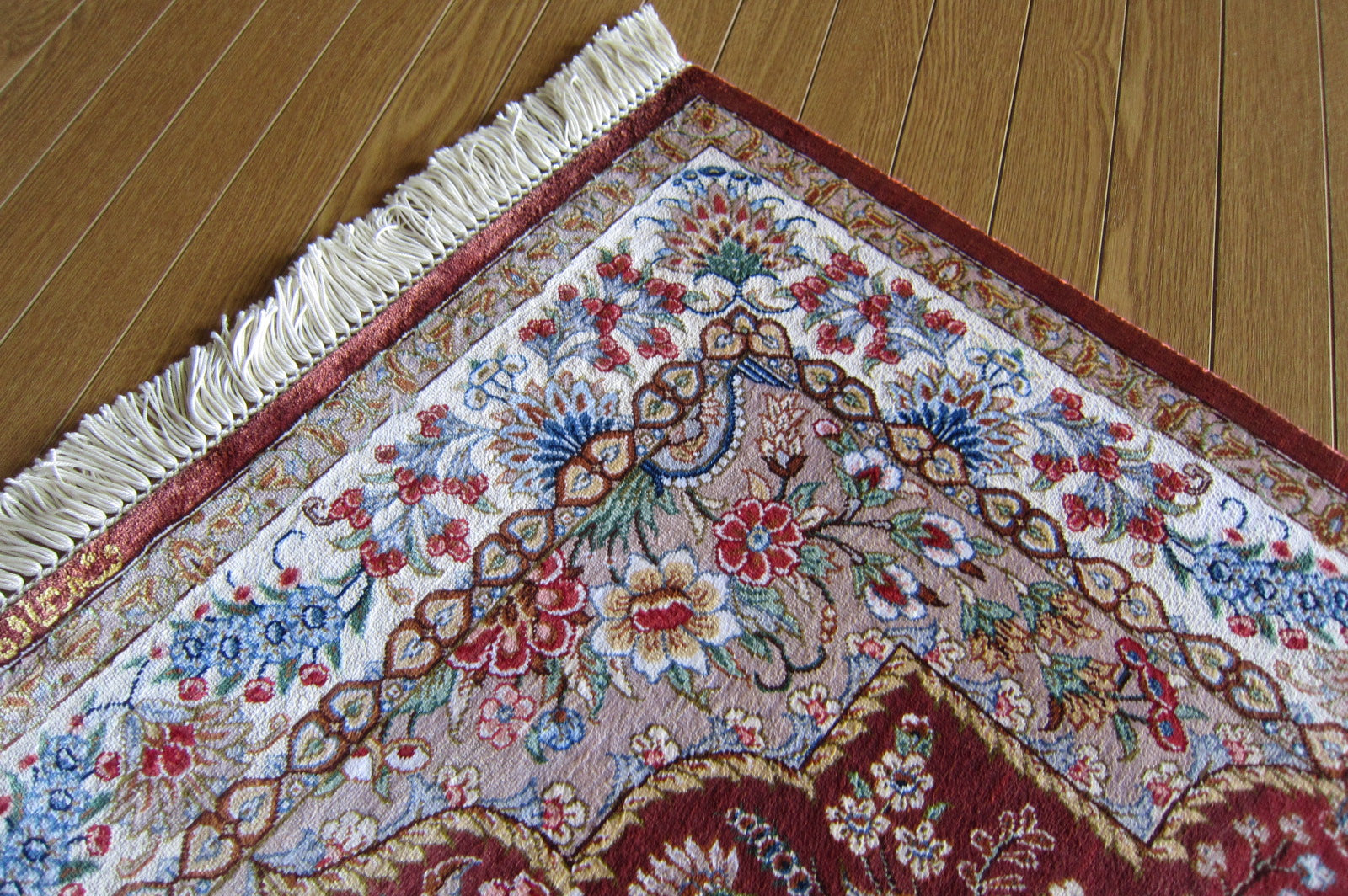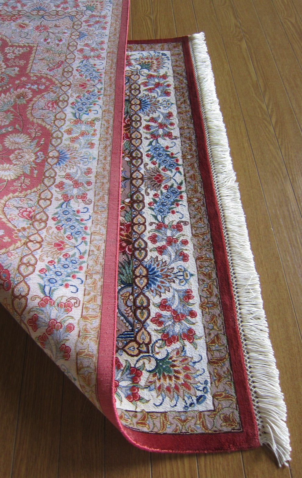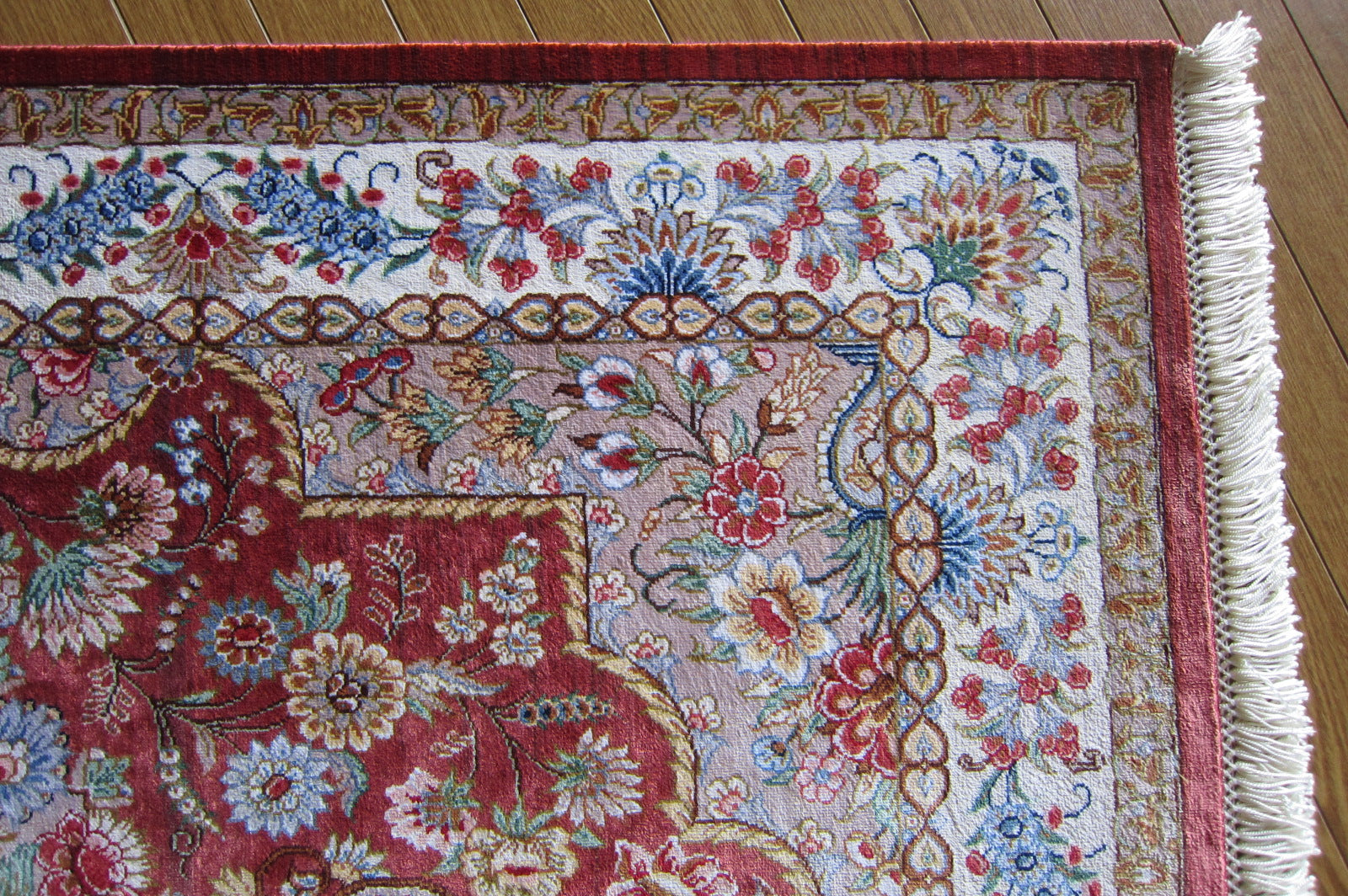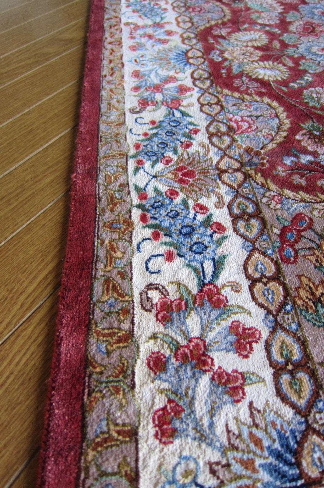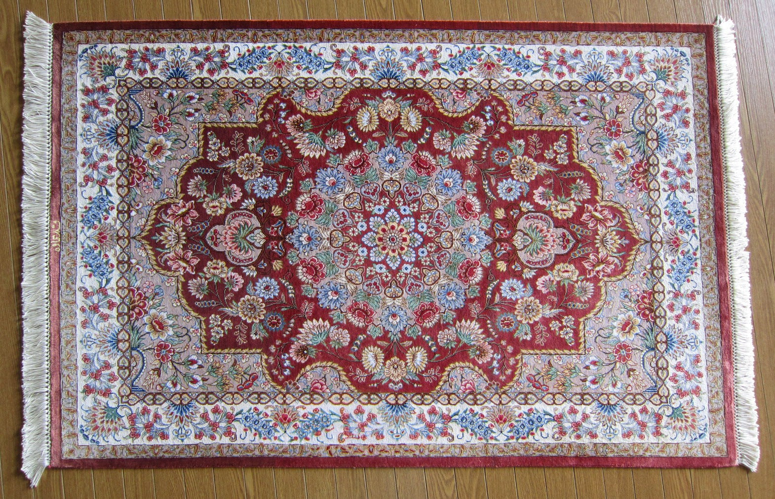 赤と青の花に囲まれたメダリオンが美しい絨毯です。
