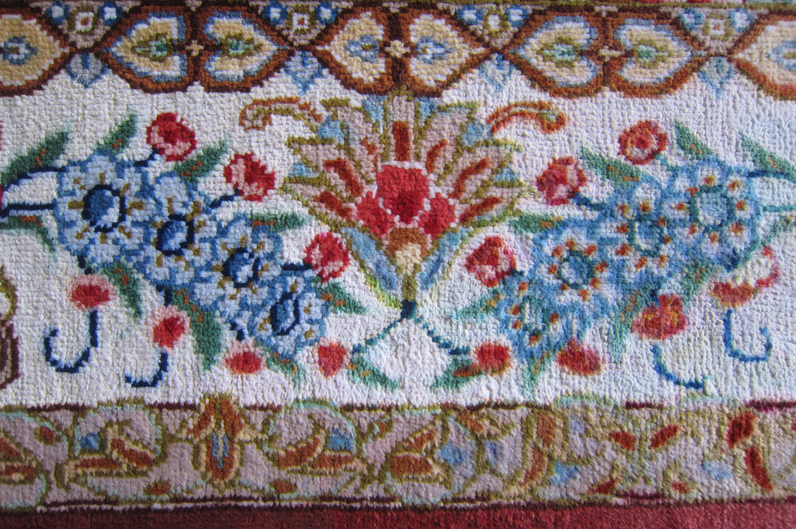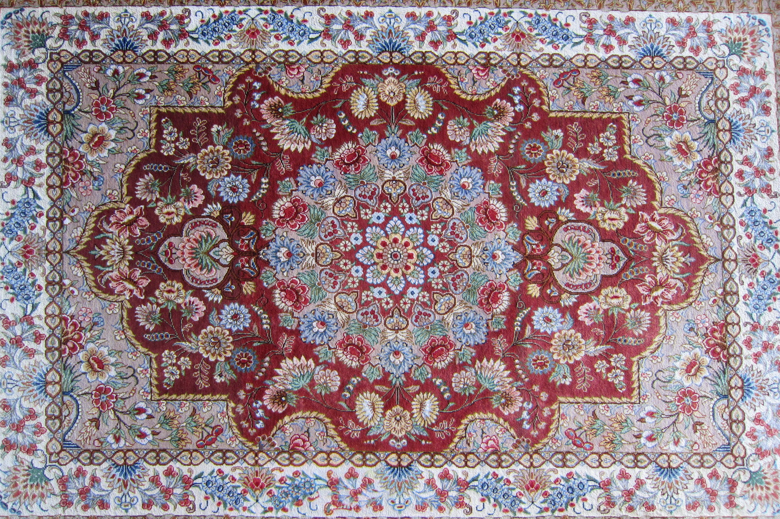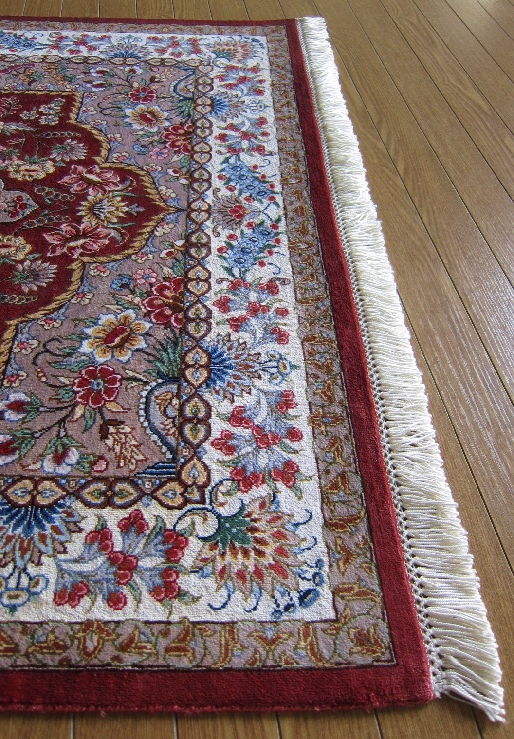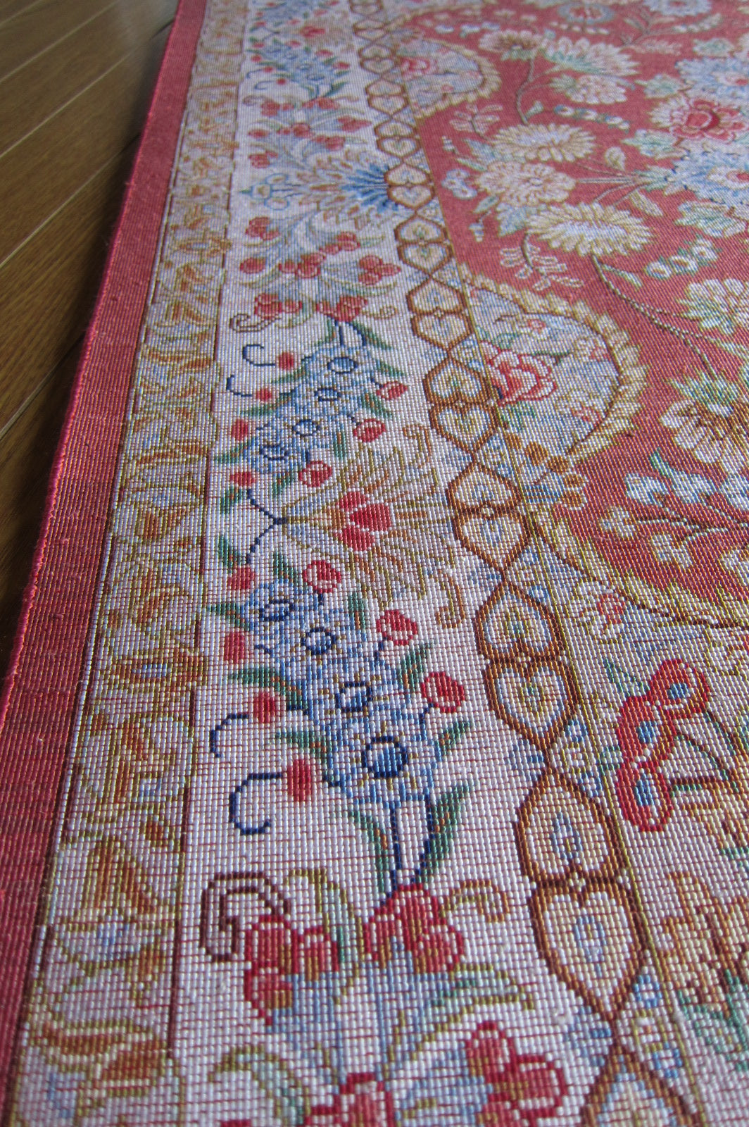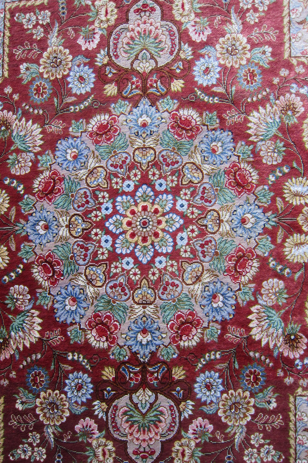 赤と青の花に囲まれたメダリオンが美しい絨毯です。