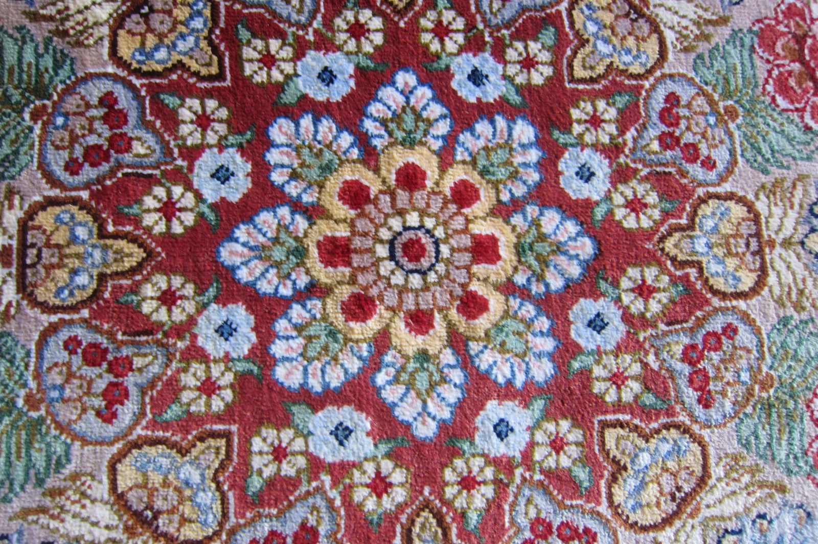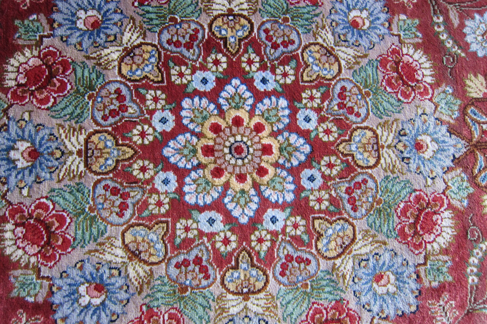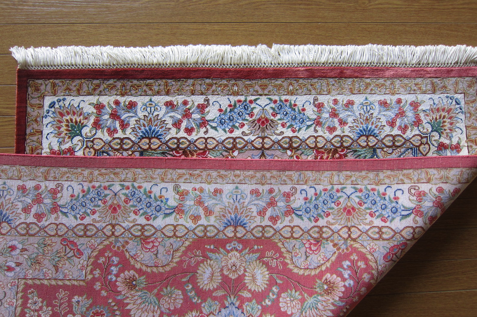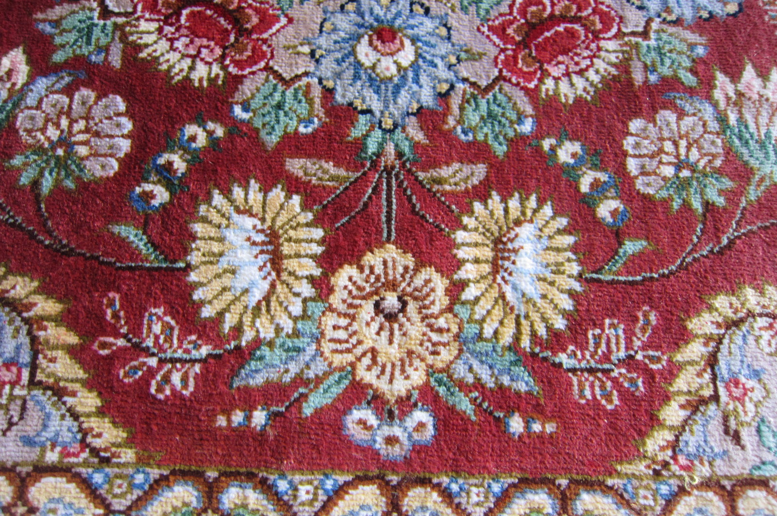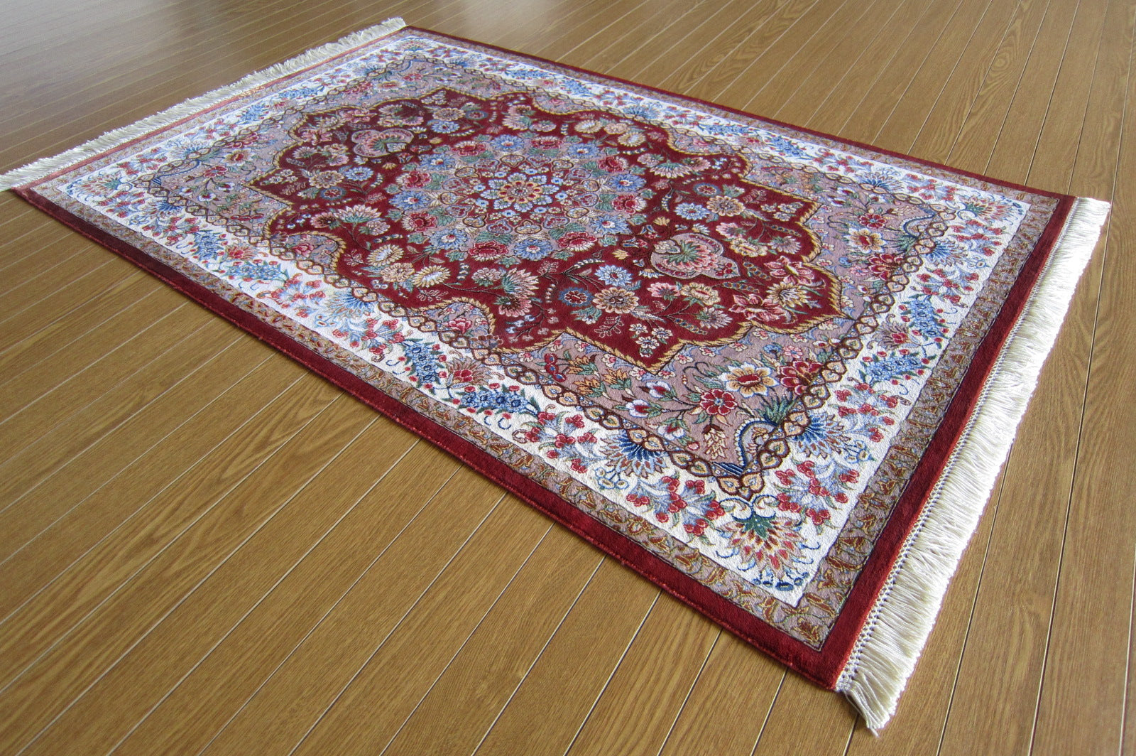 赤と青の花に囲まれたメダリオンが美しい絨毯です。