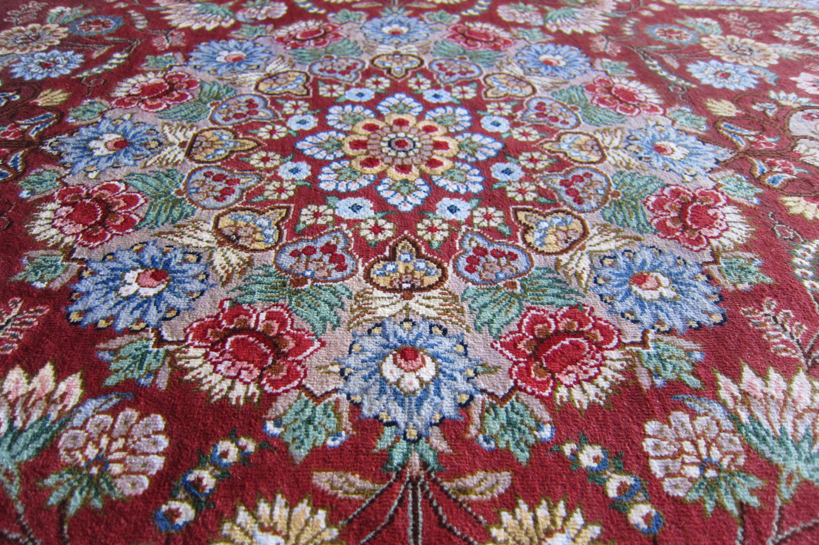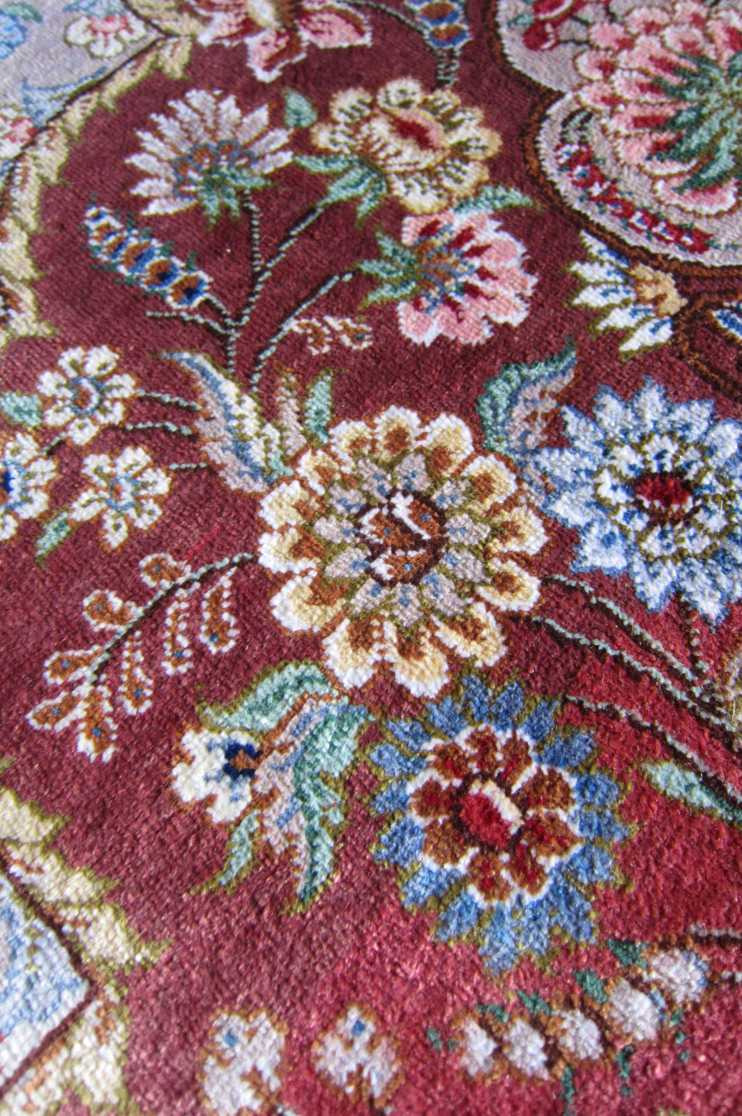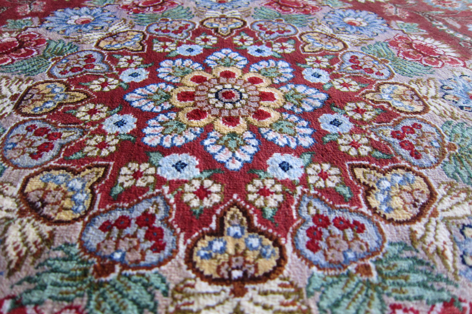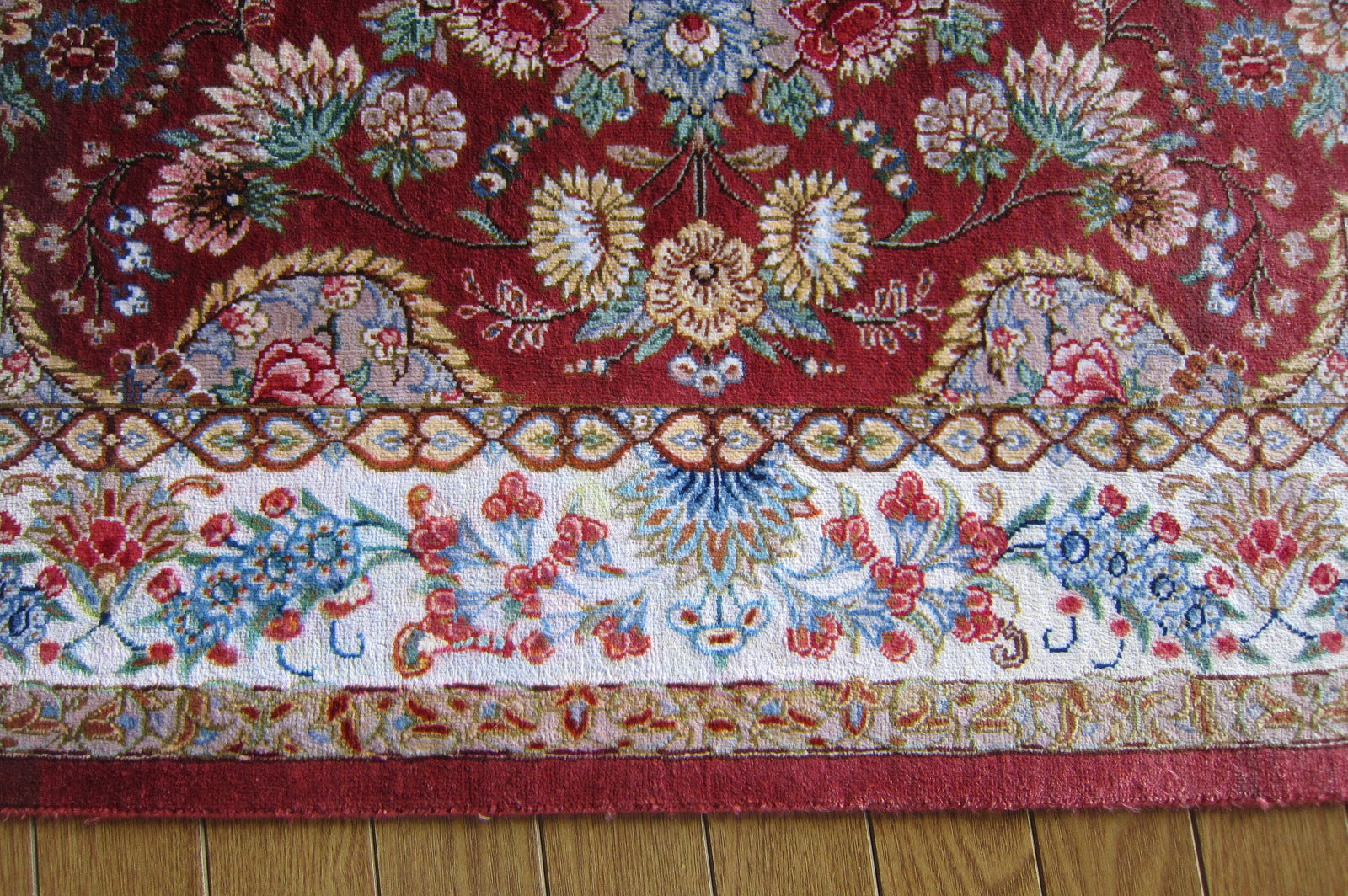 赤と青の花に囲まれたメダリオンが美しい絨毯です。