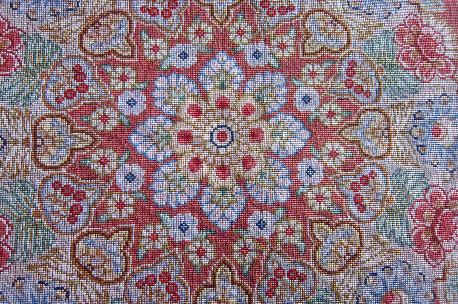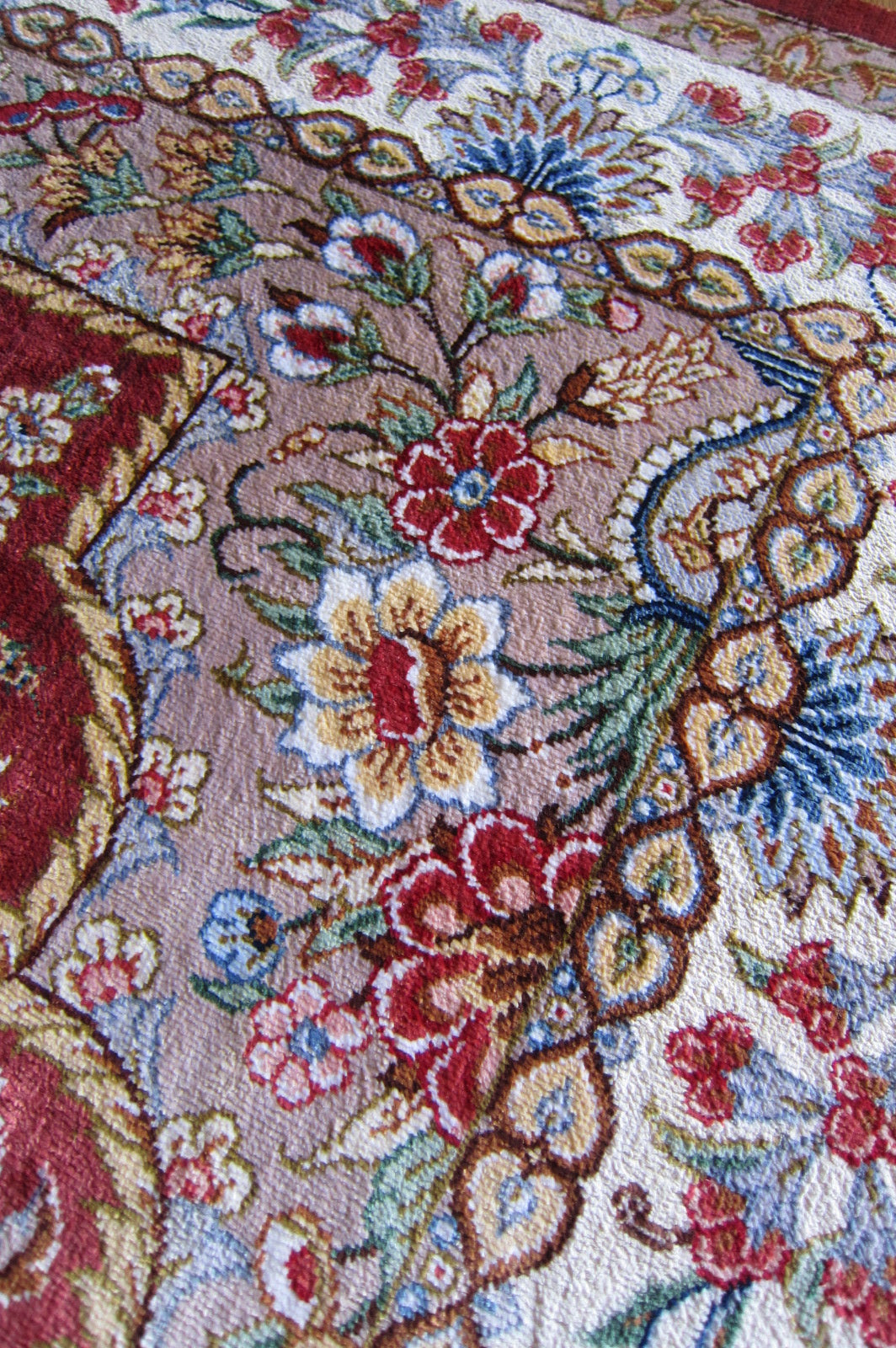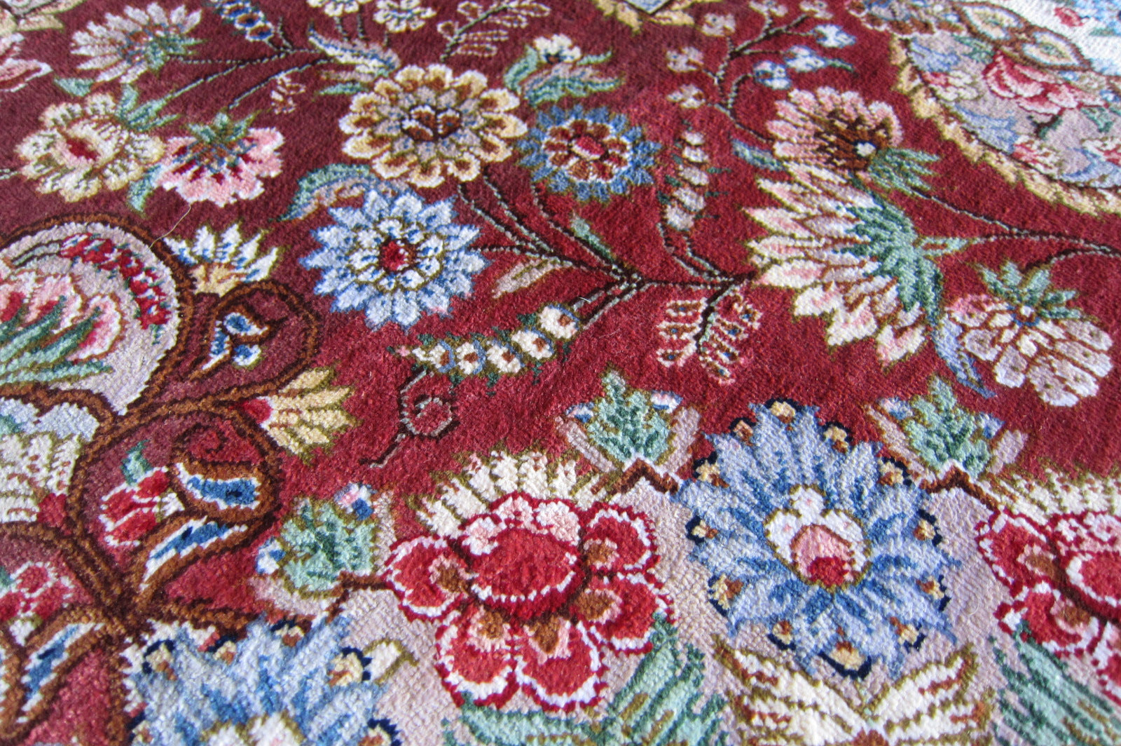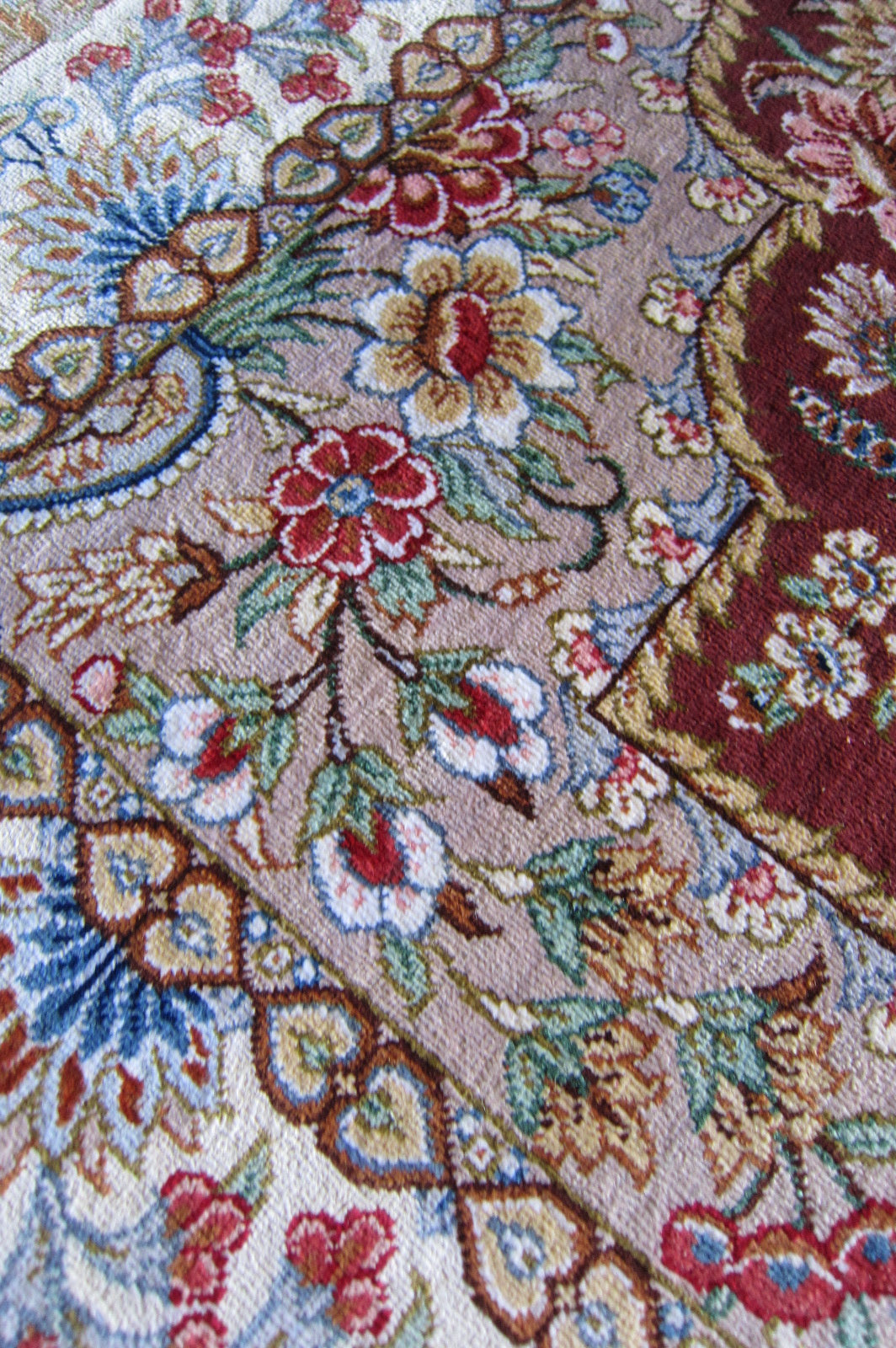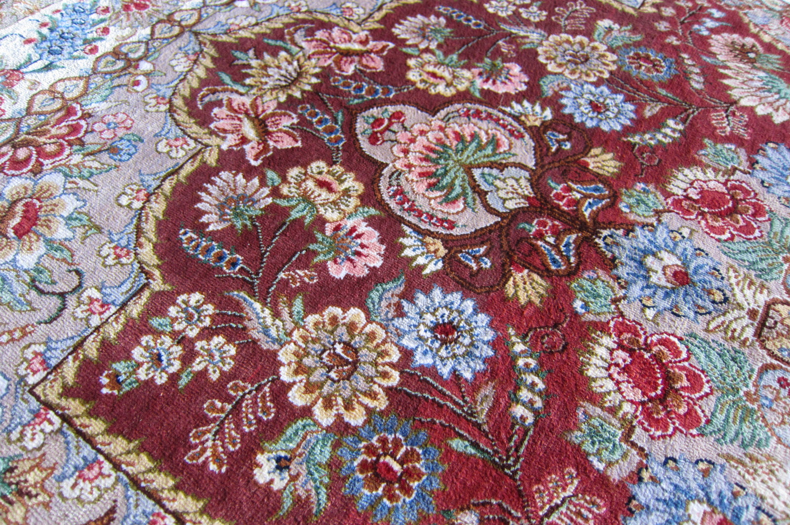 赤と青の花に囲まれたメダリオンが美しい絨毯です。
