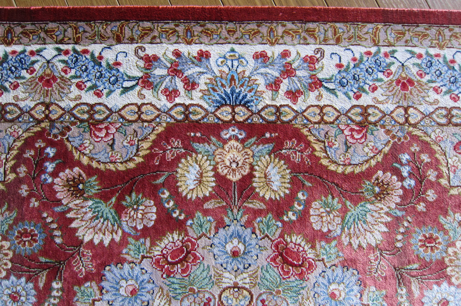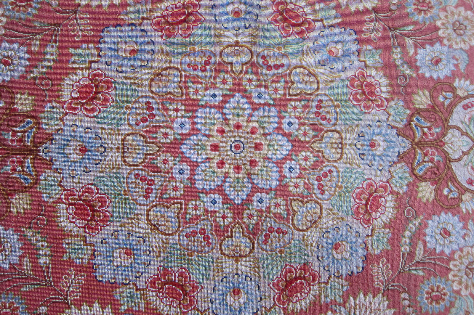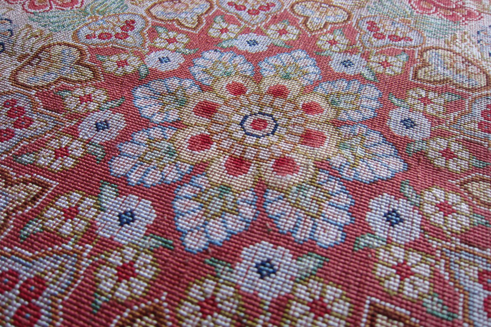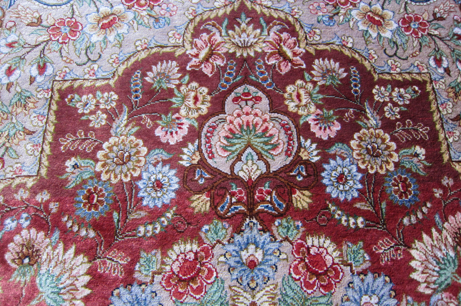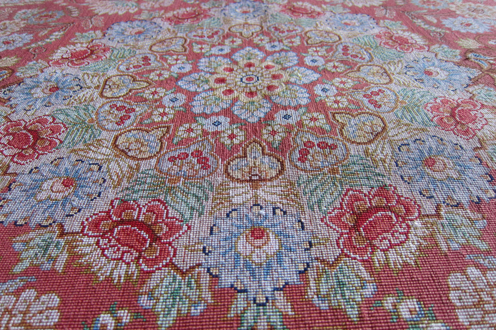 赤と青の花に囲まれたメダリオンが美しい絨毯です。