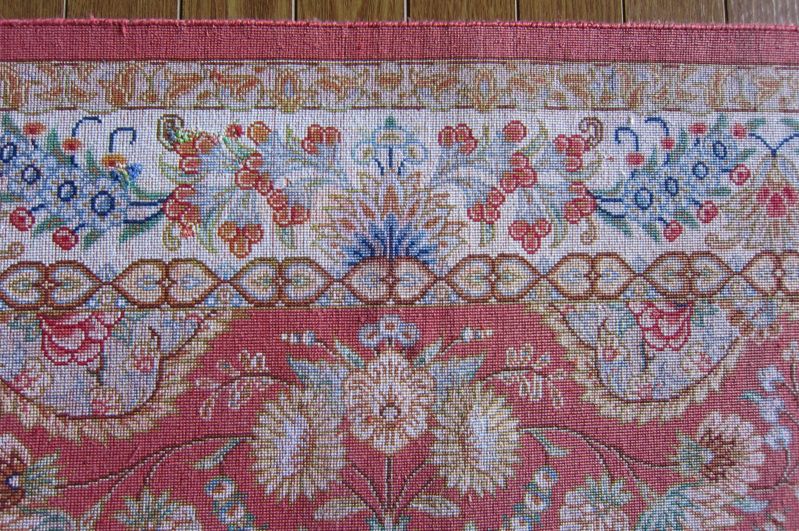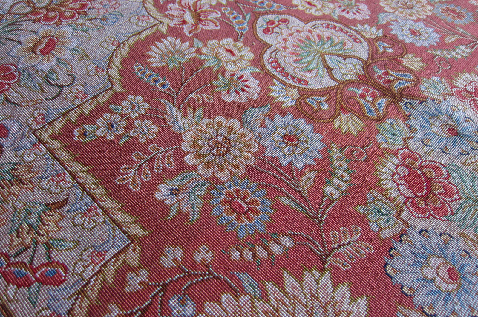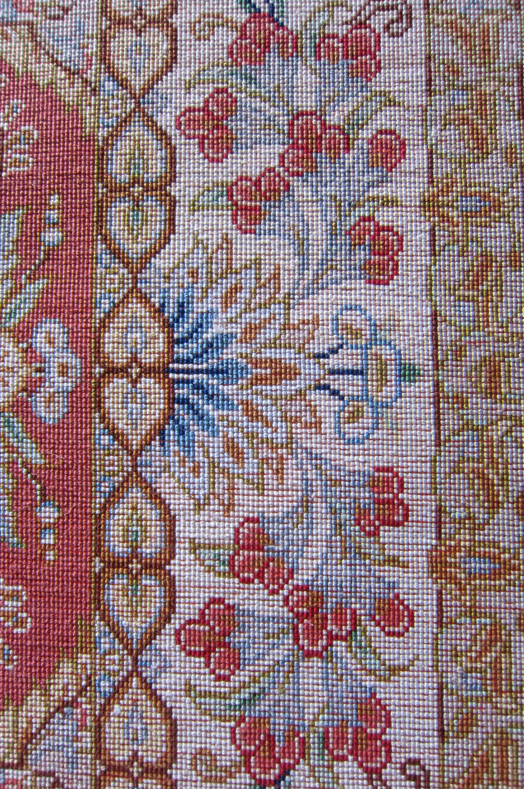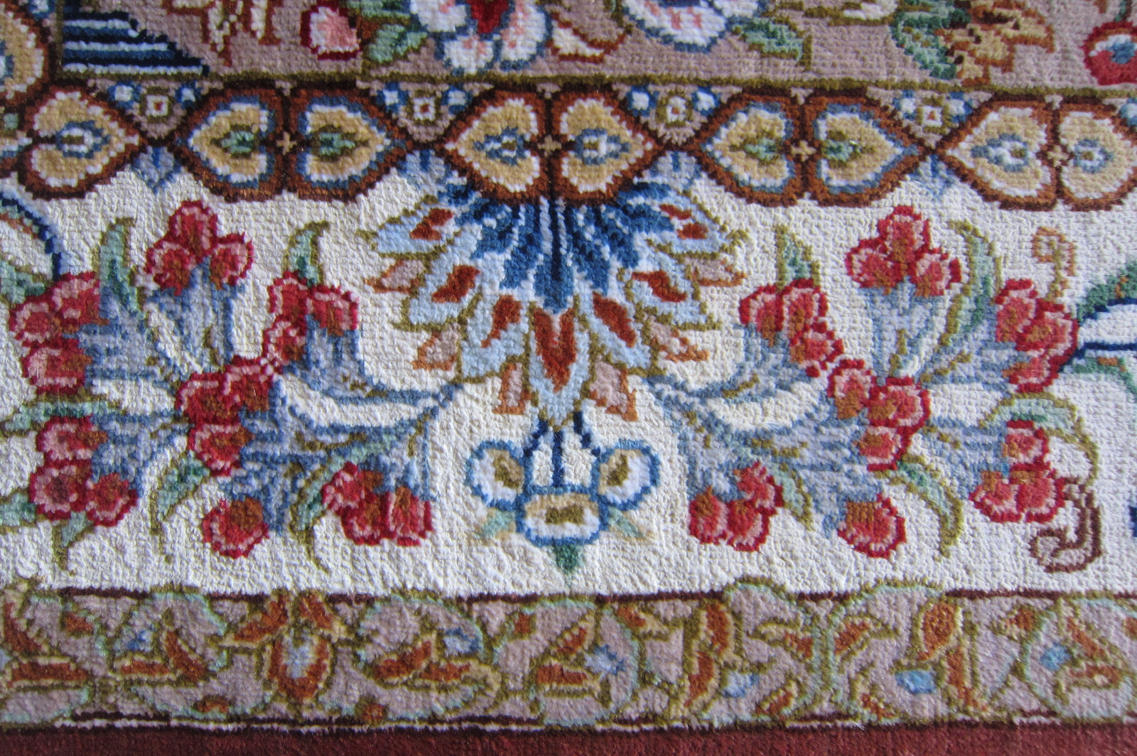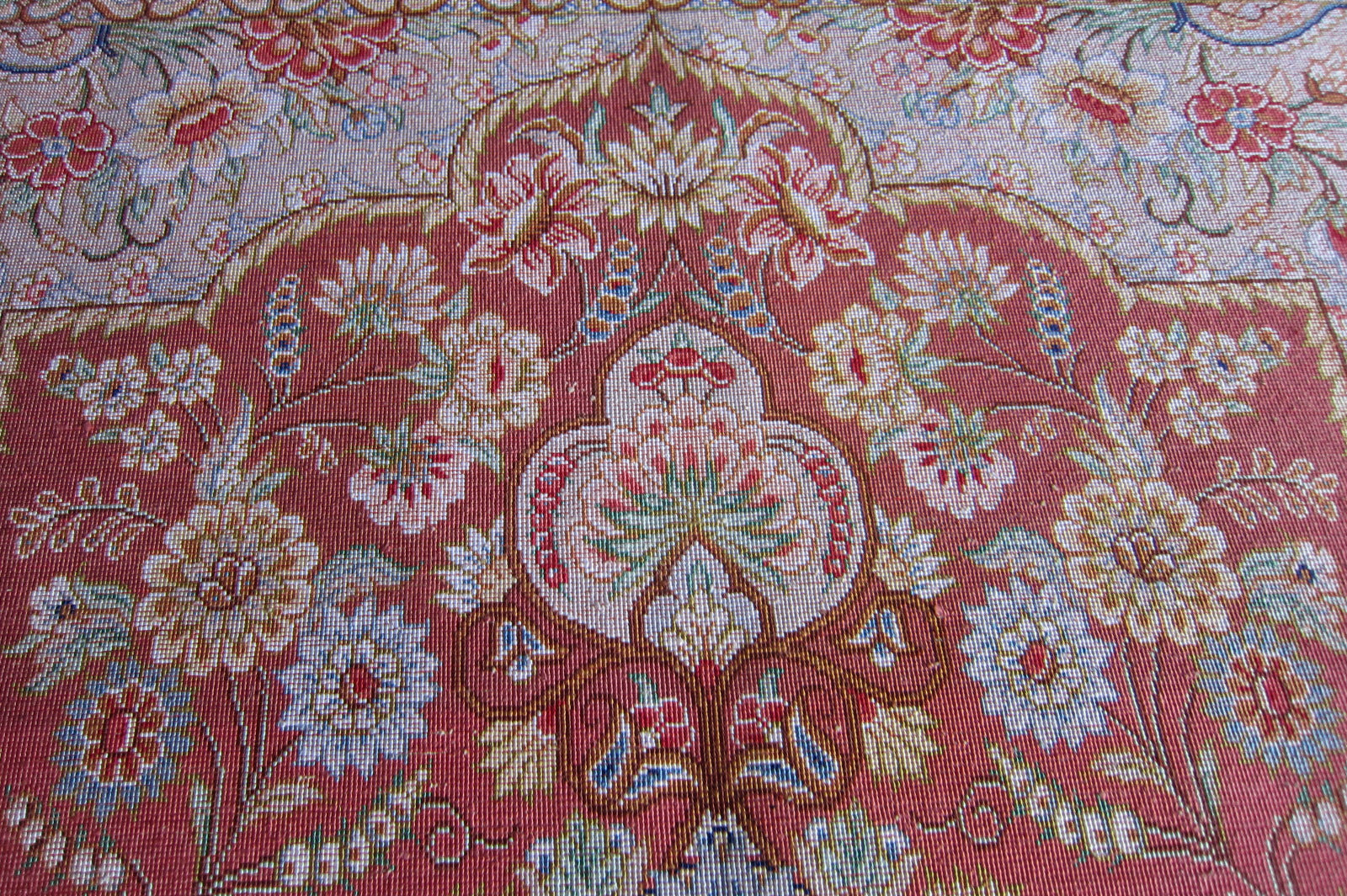 赤と青の花に囲まれたメダリオンが美しい絨毯です。